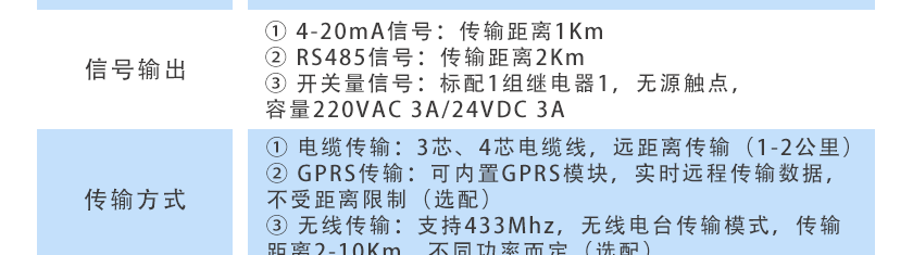 ①4-20mA信號(hào):傳輸距離1Km ②RS485信號(hào):傳輸距離2Km |
