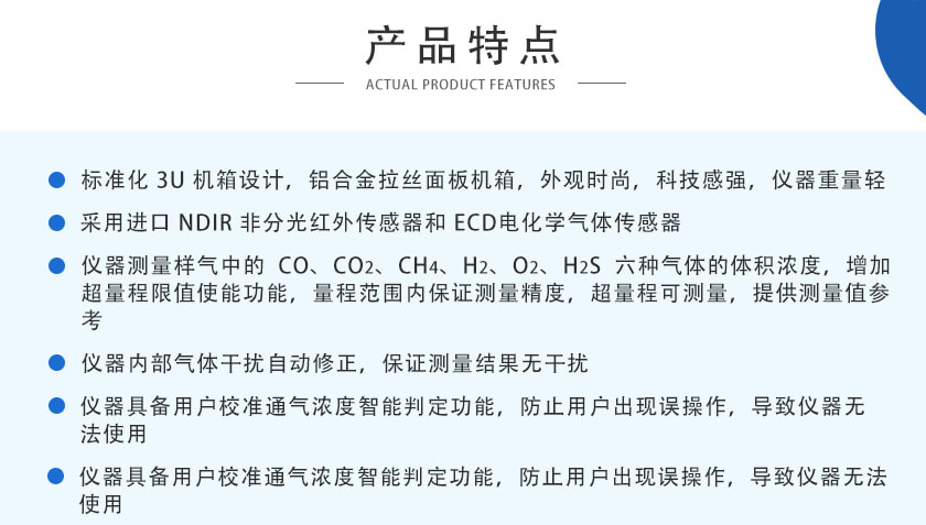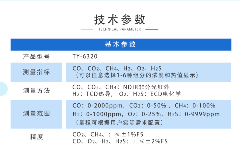 CO、CO2、CH4、:NDIR非分光紅外 H2:TCD熱導, O2、H2S:ECD電化學 |