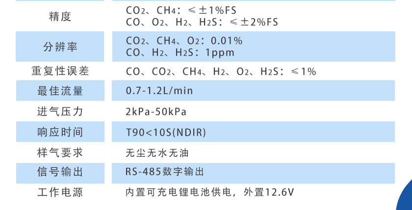 CO2、CH4、O2:0.01%;CO、H2、H2S:1ppm |