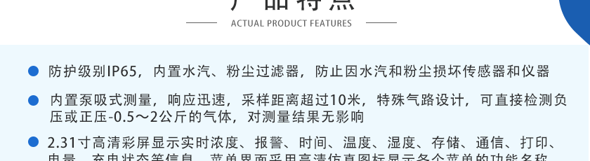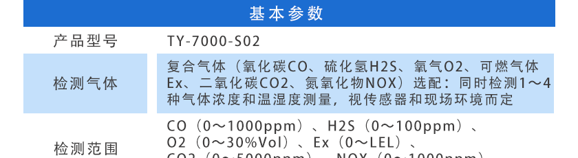 CO(0~1000ppm)、H2S(0~100ppm)、O2(0~30%Vol)、Ex(0~LEL)、CO2(0~5000ppm)、NOX(0~1000ppm),其他量程可訂制 |