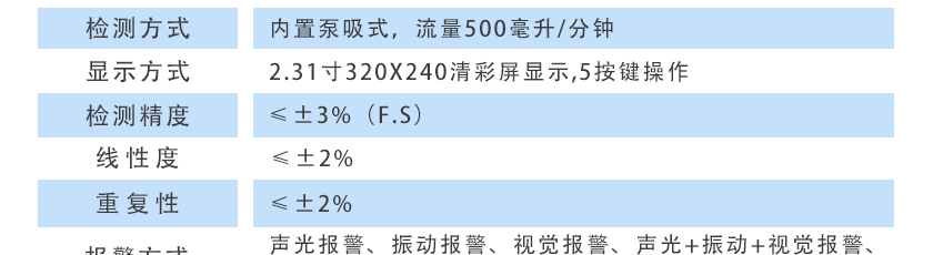 CO(0.1ppm)、H2S(0.01ppm)、O2(0.01%Vol)、Ex(0.1%LEL)、CO2(1ppm)、NOX(0.1ppm),分辨率可訂制:1ppm(0~1000 ppm以上),0.1%LEL(0~100%LEL)、0.01%Vol或0.001%Vol(0~99.999%Vol) |