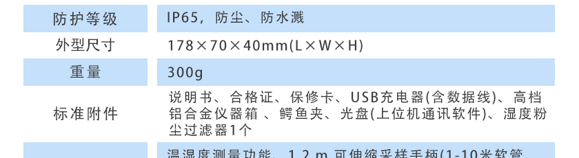 溫濕度測(cè)量功能、1.2 m 可伸縮采樣手柄(1-10米軟管,標(biāo)準(zhǔn)長(zhǎng)度1米)、高溫采樣降溫過濾手柄、高溫高濕預(yù)處理系統(tǒng)、濕度粉塵過濾器多個(gè)、掛繩 |