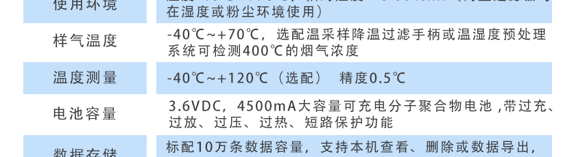 -40℃~+70℃ ,選配高溫采樣降溫過濾手柄,可檢測(cè)400度或更高溫度的煙氣濃度 |