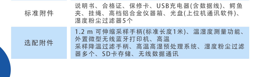 1.2m可伸縮采樣手柄(標(biāo)準(zhǔn)長(zhǎng)度1米)、溫濕度測(cè)量功能、外置微型無(wú)線藍(lán)牙打印機(jī)、高溫采樣降溫過(guò)濾手柄、高溫高濕預(yù)處理系統(tǒng)、濕度粉塵過(guò)濾器多個(gè)、SD卡存儲(chǔ)、無(wú)線數(shù)據(jù)通訊 |