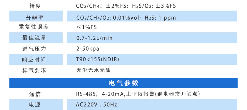 CO2/CH4:±2%FS; H2S/O2:±3%FS |