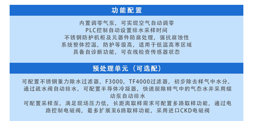 可配置不銹鋼重力除水過濾器,F3000,TF4000過濾器,初步除去樣氣中水分,通過疏水閥自動排水,可配置半導體冷凝器,快速脫除樣氣中的氣態水并采用蠕動泵自動排水。 |