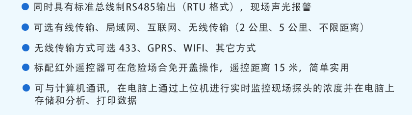 ①電纜傳輸:3芯、4芯電纜線,遠距離傳輸(1-2公里)②GPRS傳輸:可內(nèi)置GPRS模塊,實時遠程傳輸數(shù)據(jù),不受距離限制(選配)③無線傳輸:支持433Mhz,無線電臺傳輸模式,傳輸距離2-10Km,不同功率而定(選配) |