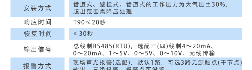電化學(xué)原理2~3年,氧氣2年或6年可選,紅外原理5~10年,催化燃燒3年、熱導(dǎo)5年 |