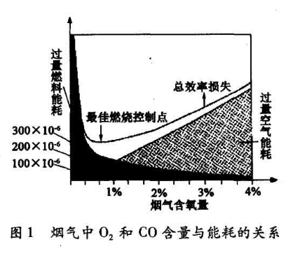 由圖1可見,“過量空氣能耗”表示富余的空氣形成的熱損失,表征為煙氣中的氧含量。“過量燃料能耗”表示由未完全燃燒的燃料所引起的能耗,表征為煙氣中CO含量。若要降低能耗,須降低煙氣中的O2含量和CO含量,但兩者是相互制約的。最佳的燃燒控制點(diǎn)的熱損失最小、熱效率最高,其氣體O2含量約為1%。
