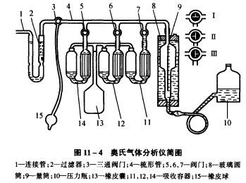 采用氫氧化鈉溶液吸收CO2,以焦性沒(méi)食子酸堿性溶液吸收CO2,采用爆炸燃燒法后采用吸收法測(cè)量CH4,從而測(cè)出CH4、CO2、O2的含量。